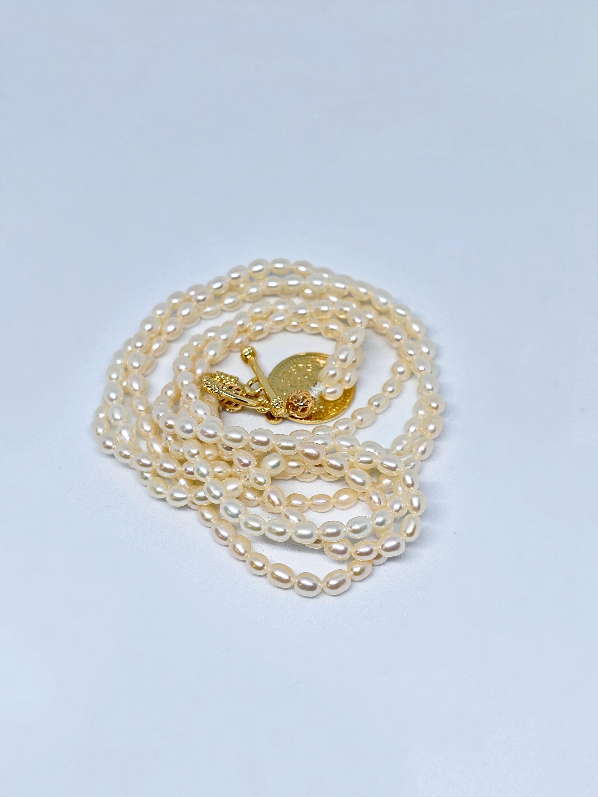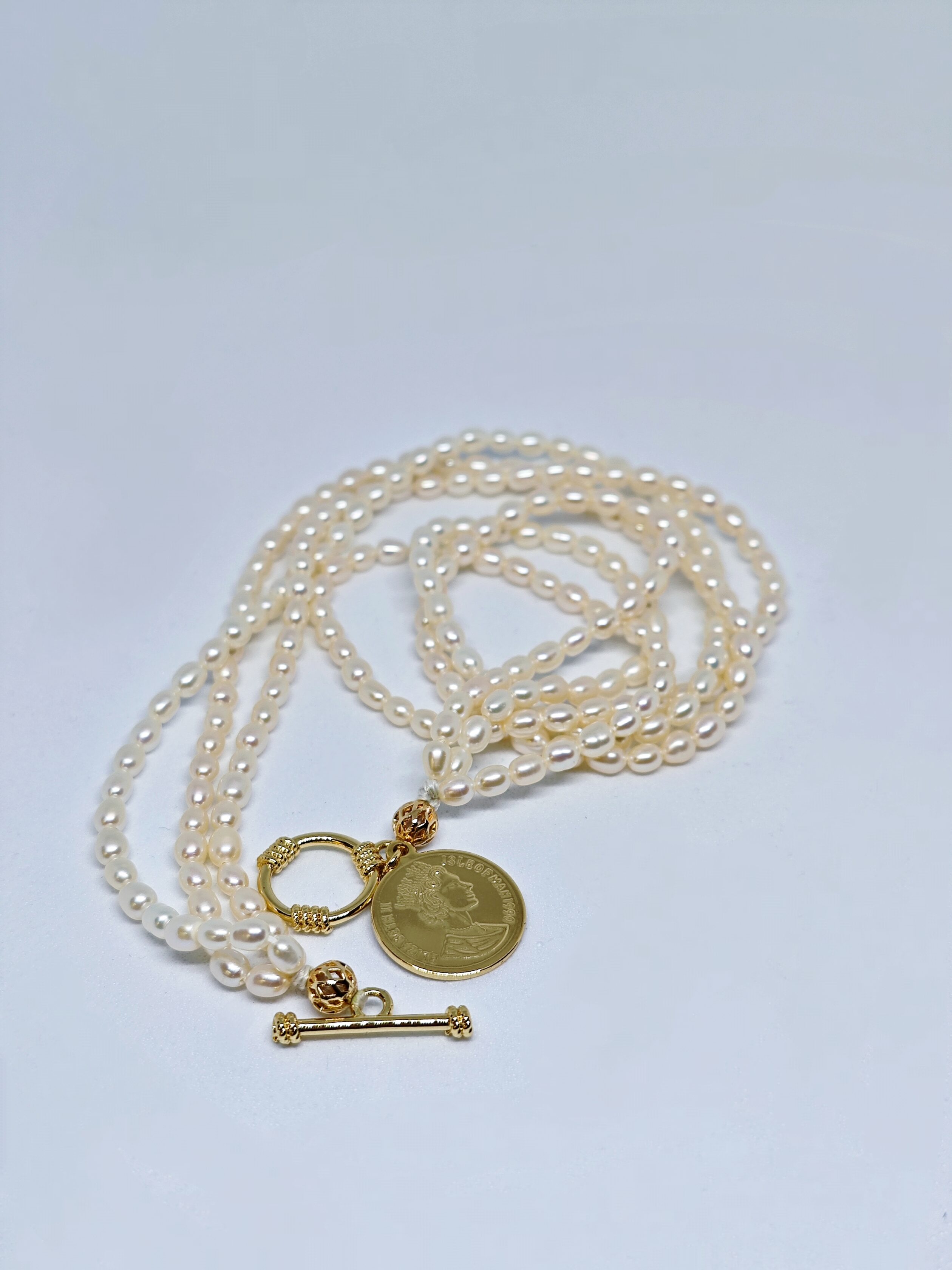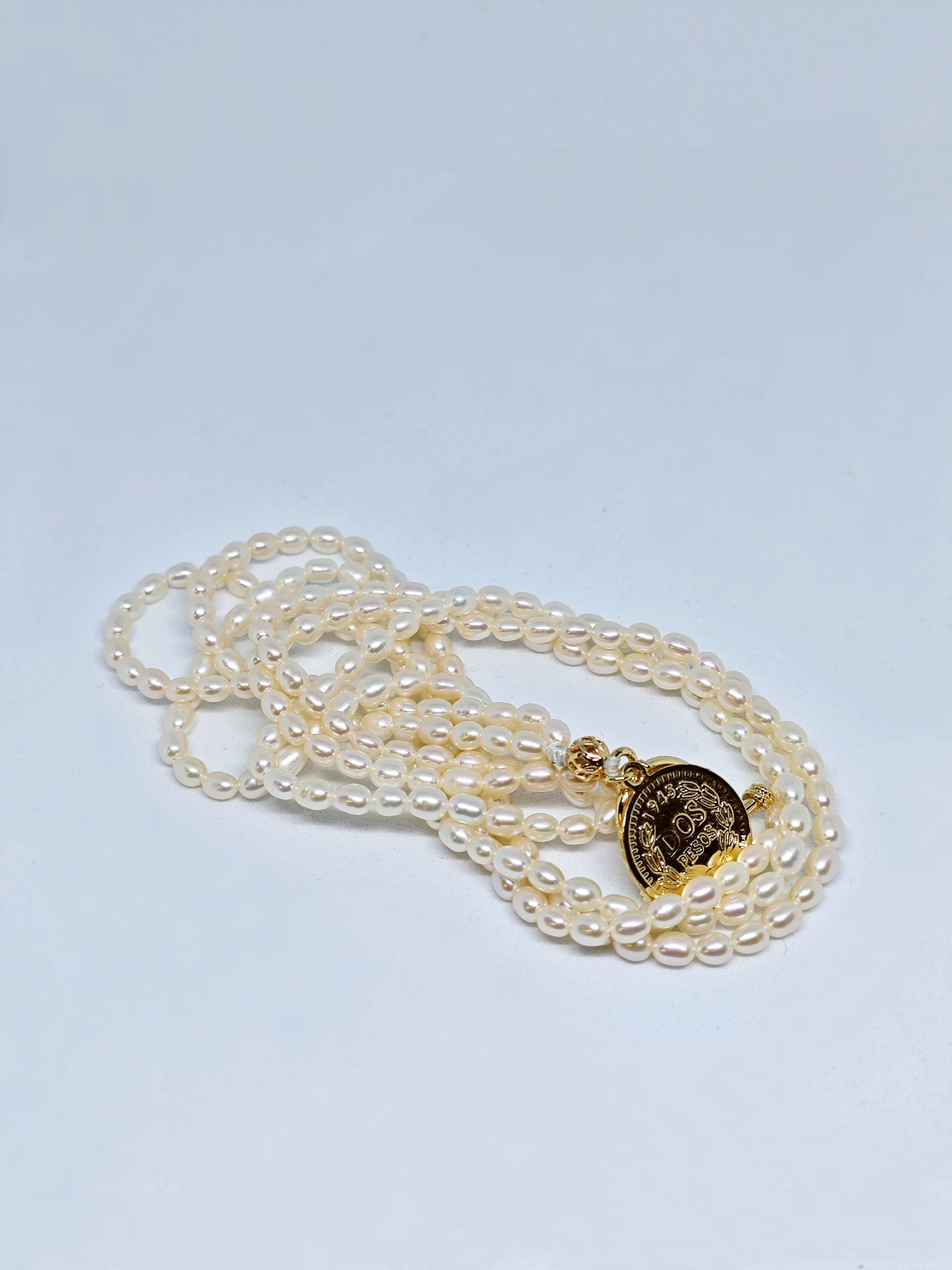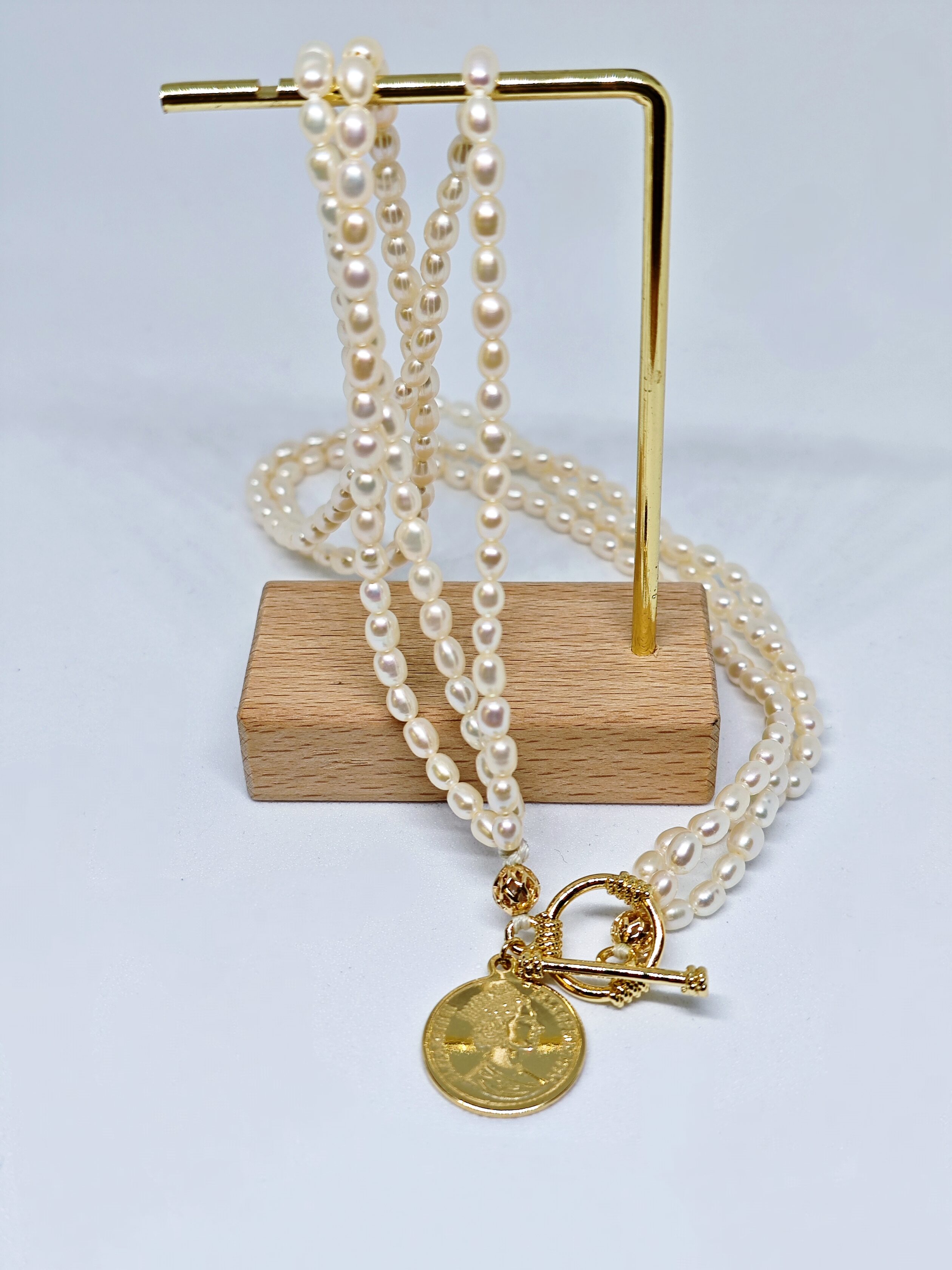 Este collar “Moneda de la Reina” está elaborado con perlas cultivadas de forma ovalada, de un brillo suave y elegante. Destaca por un colgante dorado con una moneda que evoca la figura de la reina, aportando un aire real y sofisticado. Su diseño fusiona lo vintage y lo contemporáneo, perfecto para lucirse tanto en el día a día como en eventos especiales, reflejando distinción y confianza. Es la elección ideal para mujeres con gusto exclusivo.