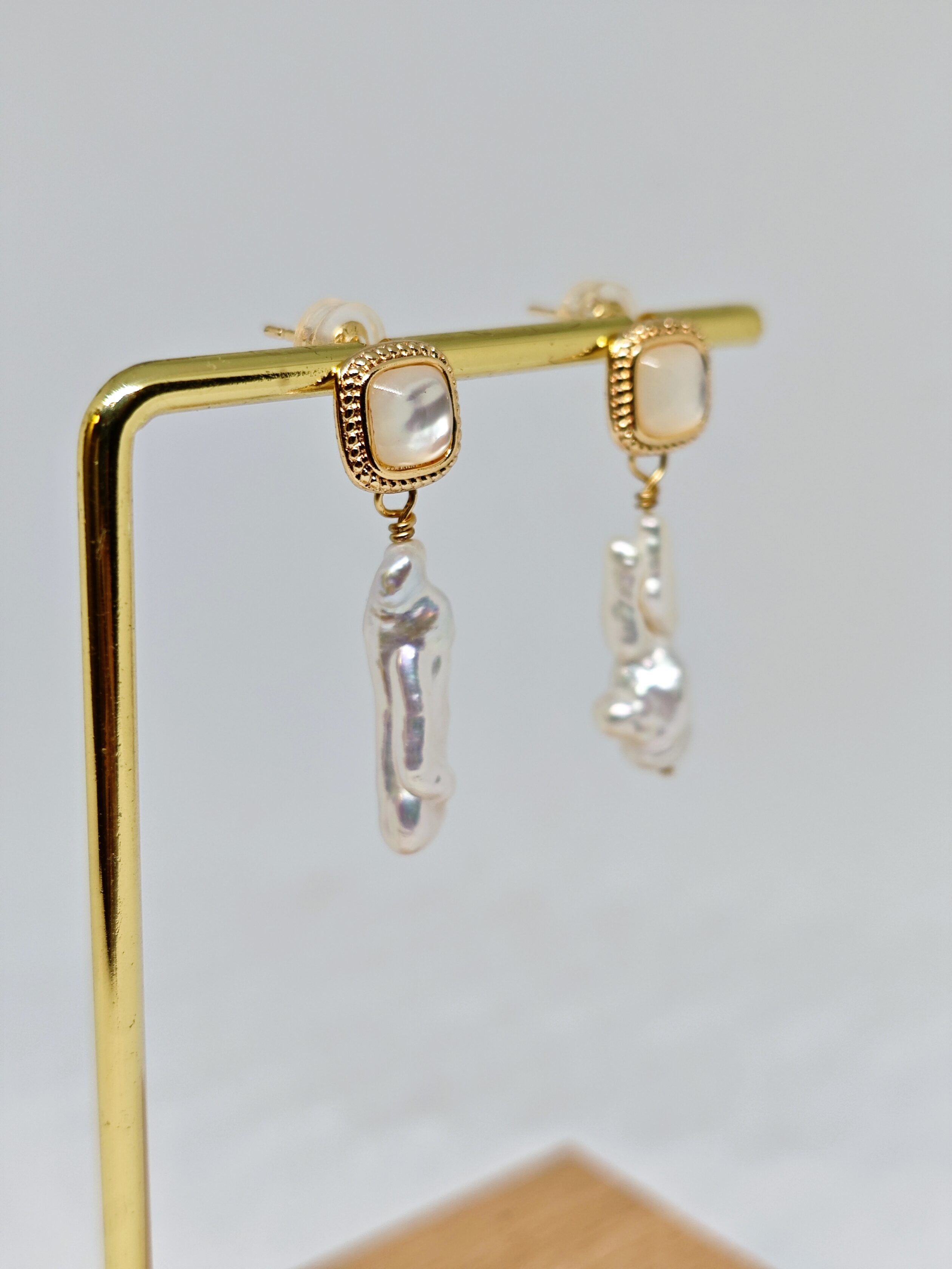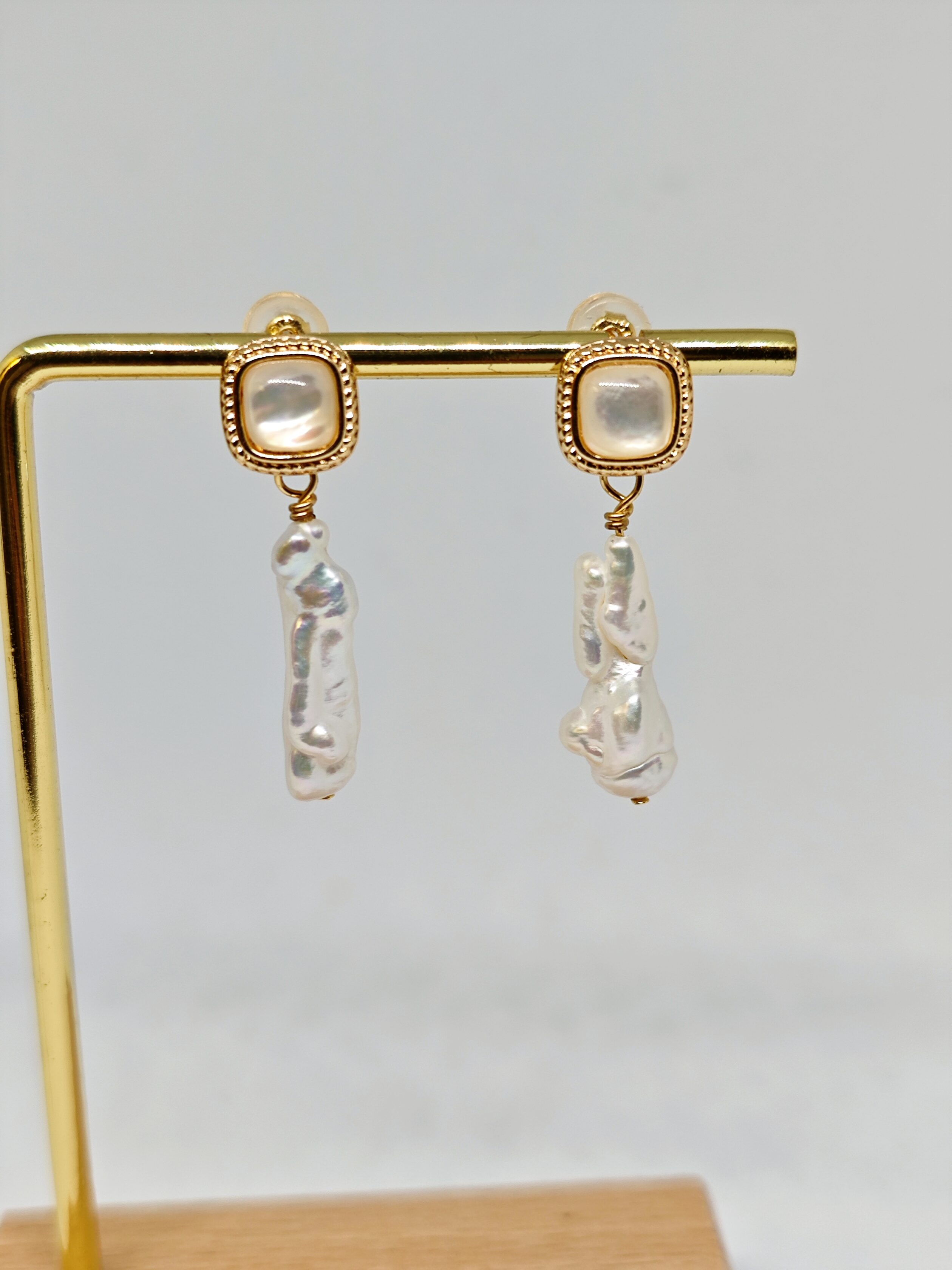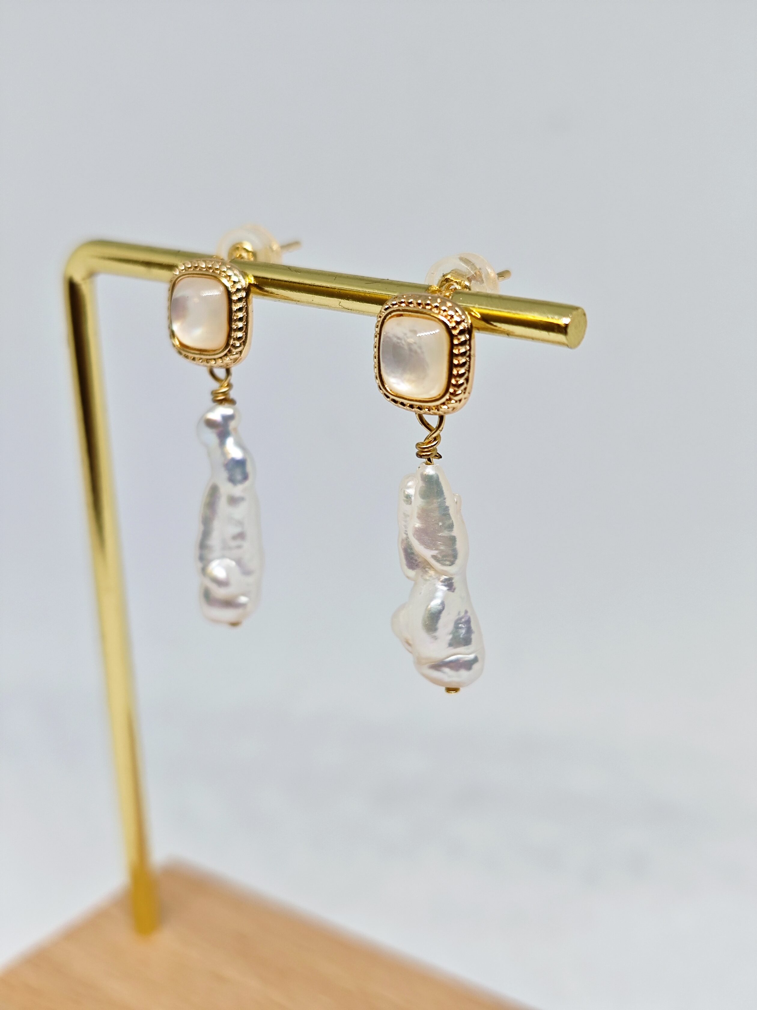 Una delicada pieza cuadrada de nácar (madreperla) brilla con un suave y sutil resplandor, combinada con perlas barrocas alargadas y naturalmente irregulares que cuelgan debajo. Cada detalle es una obra de arte única, mientras el borde dorado aporta un toque de elegancia refinada.