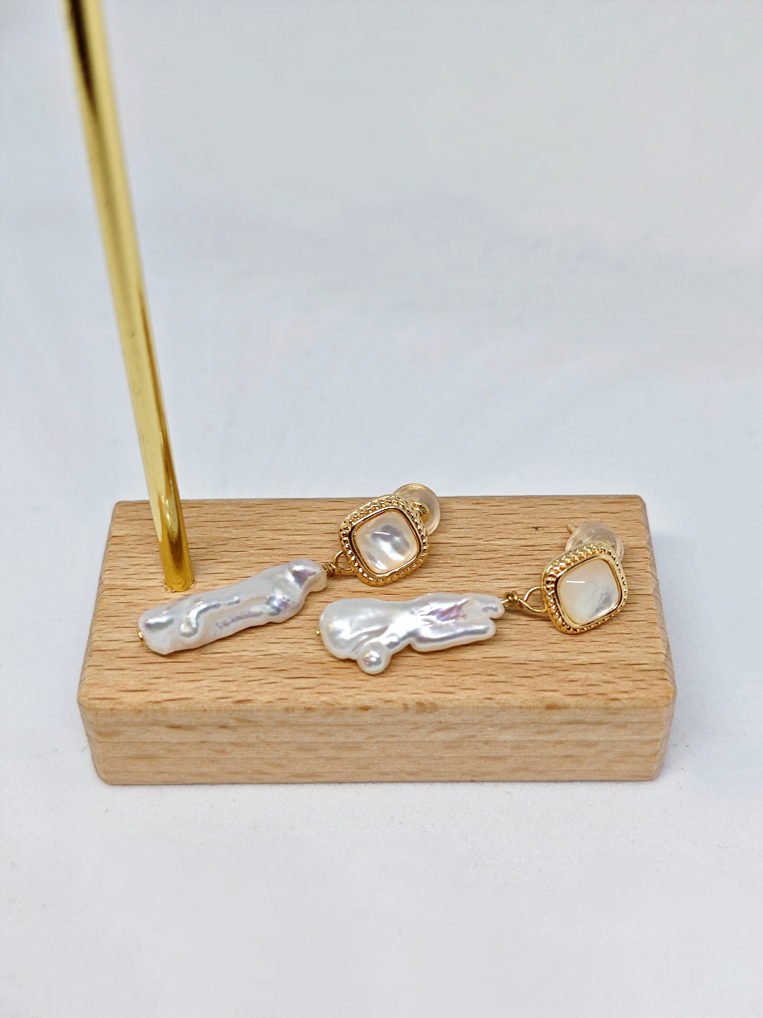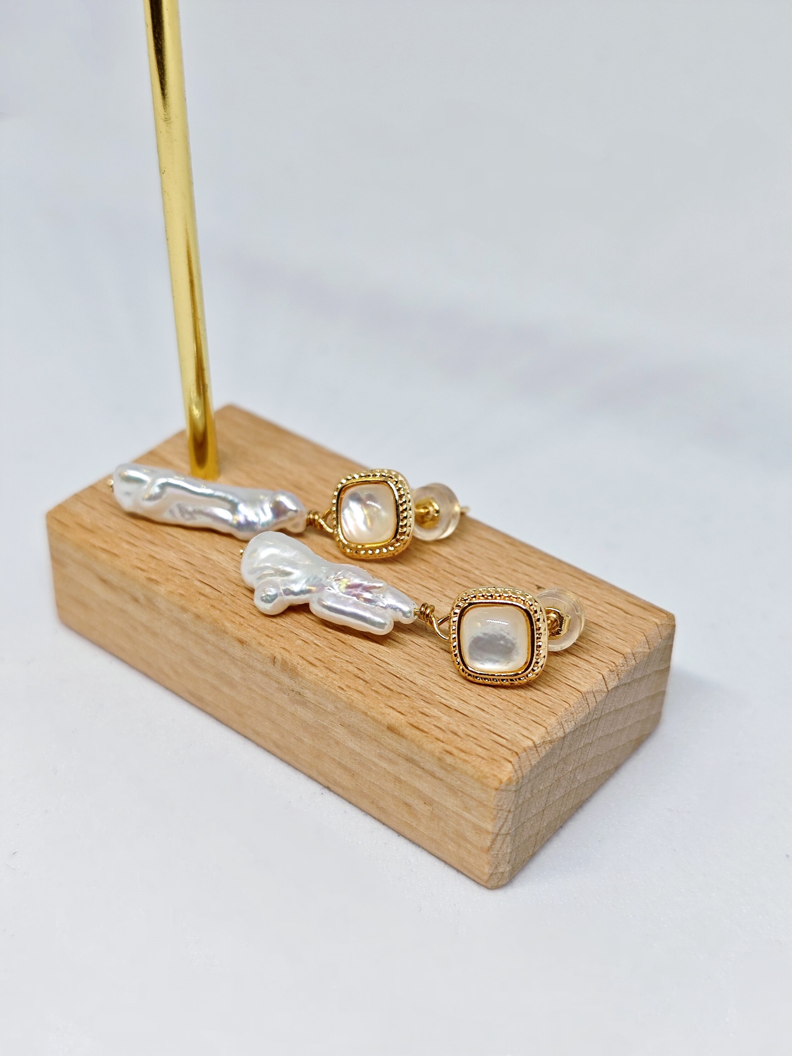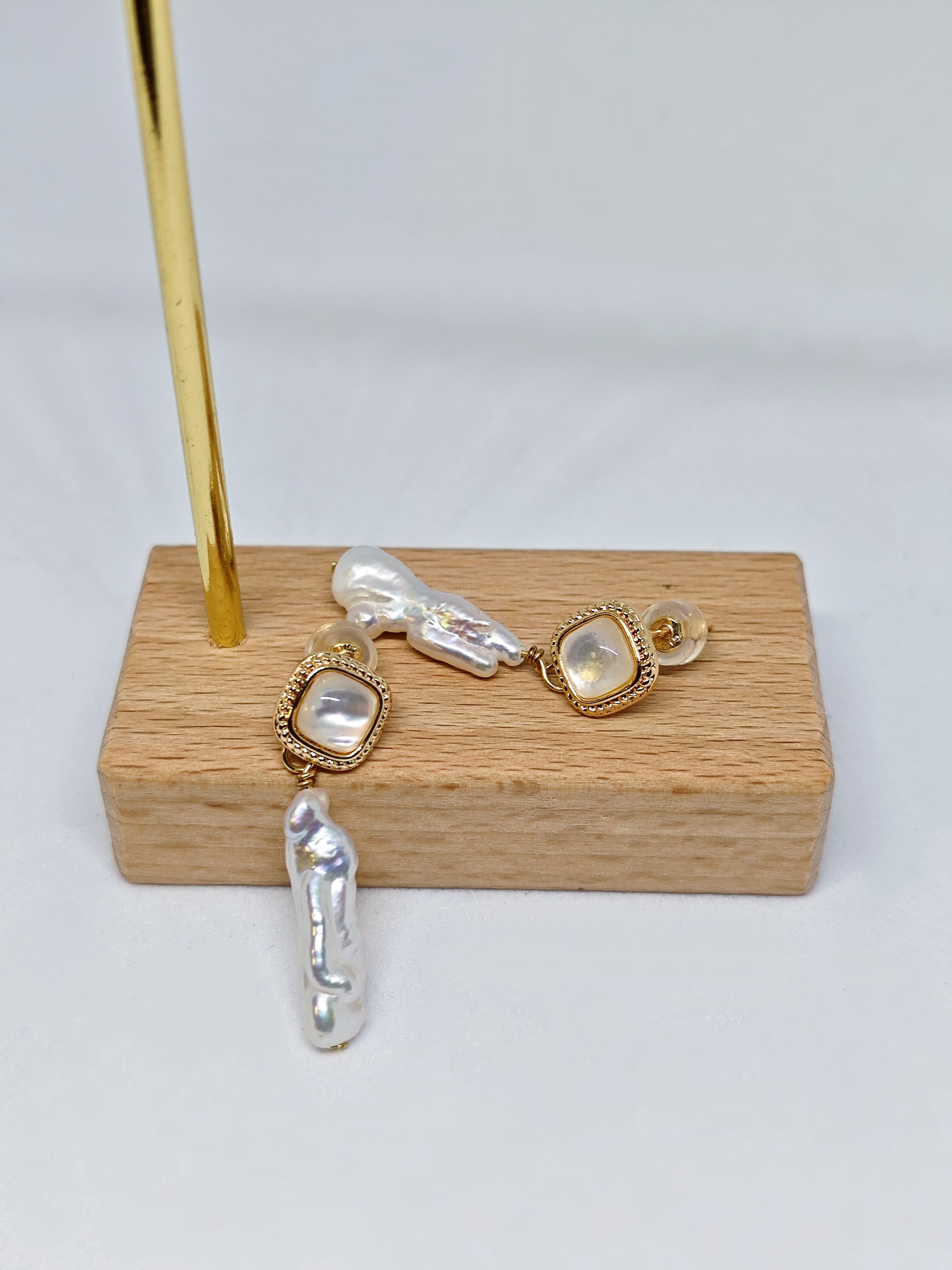 Una delicada pieza cuadrada de nácar (madreperla) brilla con un suave y sutil resplandor, combinada con perlas barrocas alargadas y naturalmente irregulares que cuelgan debajo. Cada detalle es una obra de arte única, mientras el borde dorado aporta un toque de elegancia refinada.